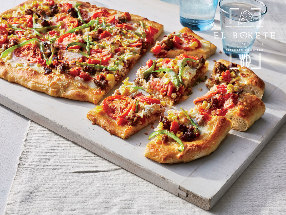 Ingredientes al gusto: Atún, jamón, bacon, cebolla, pimiento, champiñones, salami, aceitunas, maíz y queso